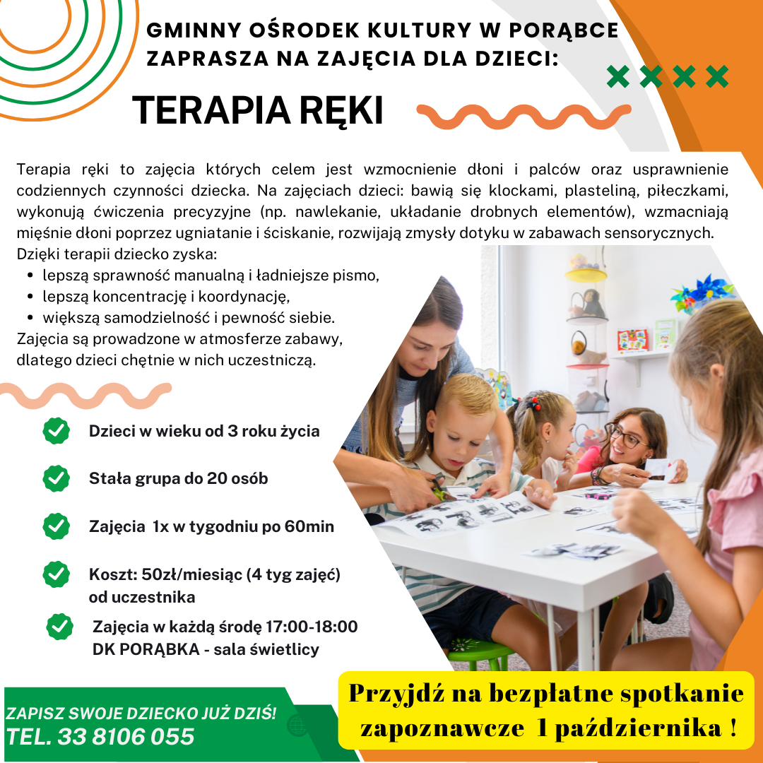 Zapraszamy na TERAPIĘ RĘKI – wyjątkowe zajęcia, których celem jest wzmocnienie dłoni i palców oraz ułatwienie codziennych czynności dziecka poprzez zabawę