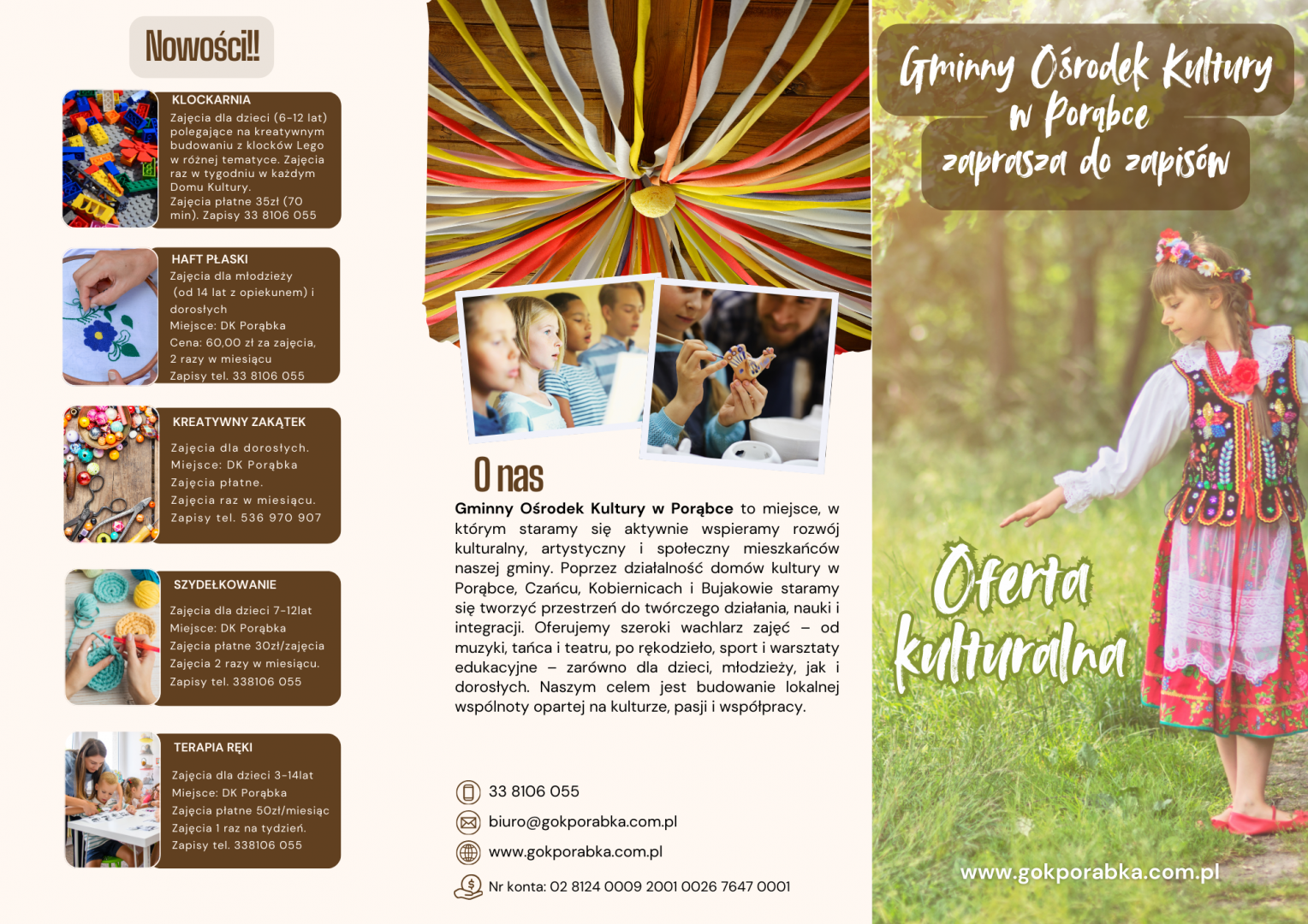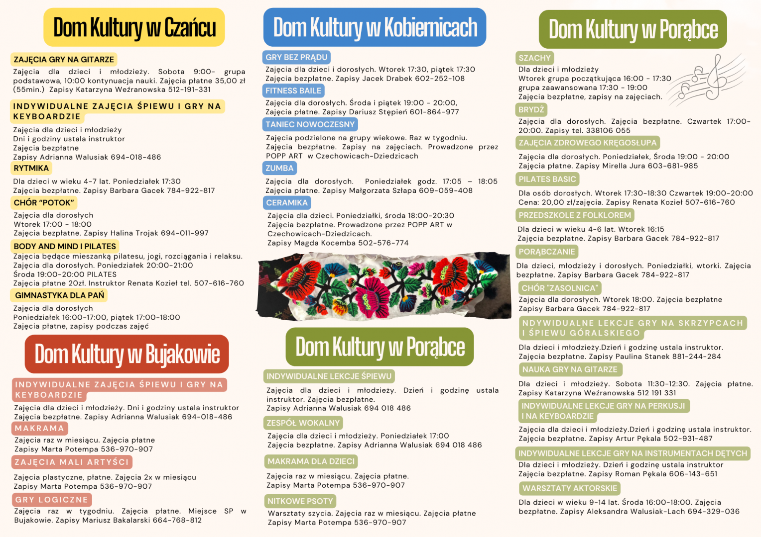 Przedstawiamy najnowszą broszurę z bogatą ofertą zajęć kulturalnych i edukacyjnych dla dzieci, młodzieży i dorosłych. W Domach Kultury w Porąbce, Czańcu, Kobiernicach i Bujakowie znajdziecie szeroki wybór warsztatów i spotkań, które rozwijają pasje, integrują i inspirują!