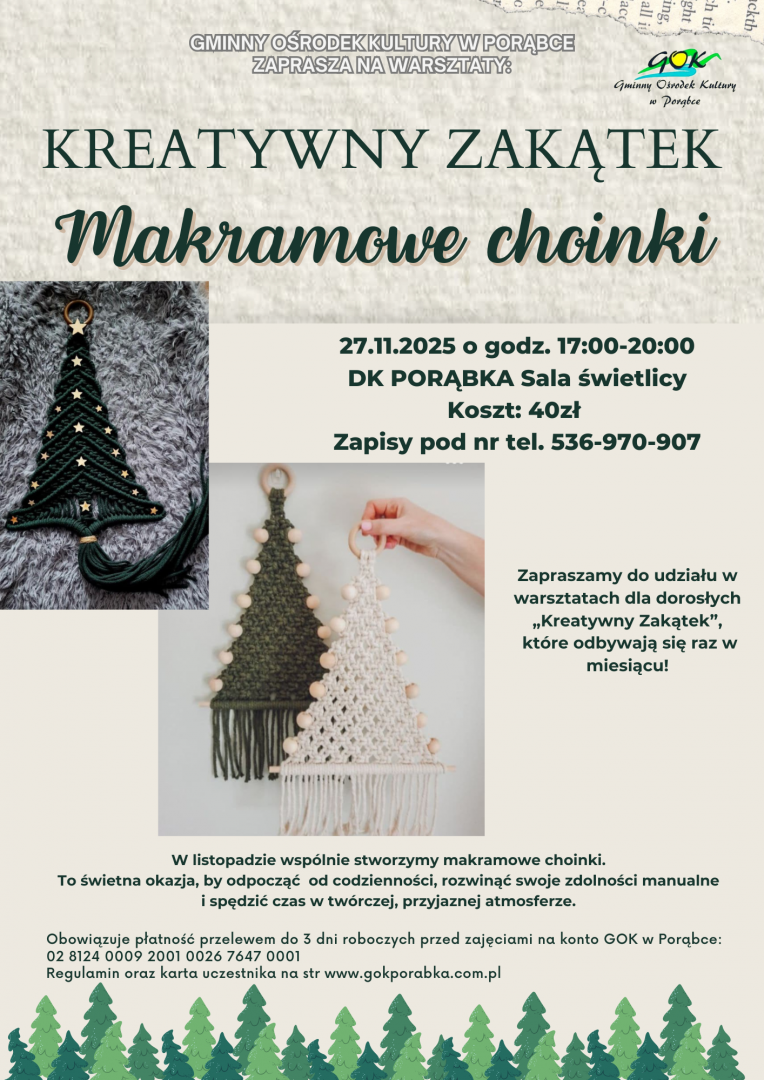 Obowiązuje płatność przelewem do 3 dni roboczych przed zajęciami na konto GOK w Porąbce: