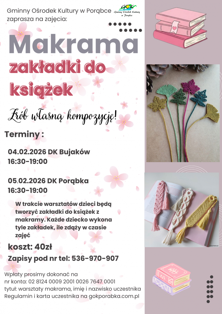 Gminny Ośrodek Kultury w Porąbce zaprasza na warsztaty makramy – tworzenie zakładek do książek.