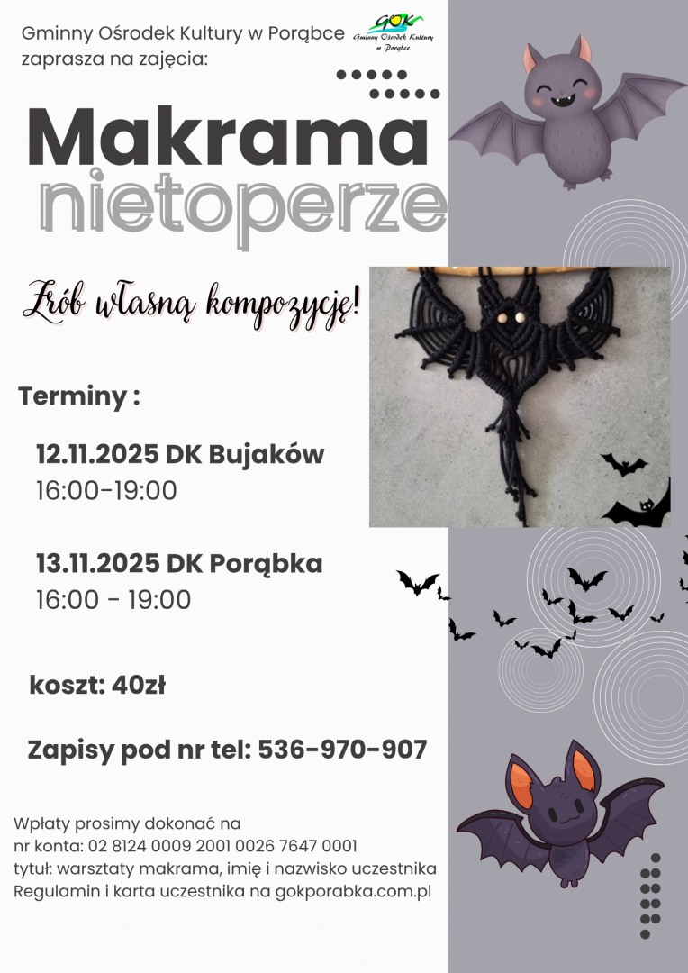 Gminny Ośrodek Kultury w Porąbce zaprasza dzieci na kreatywne warsztaty, podczas których wykonają wyjątkową ozdobę z makramy w kształcie nietoperza.
